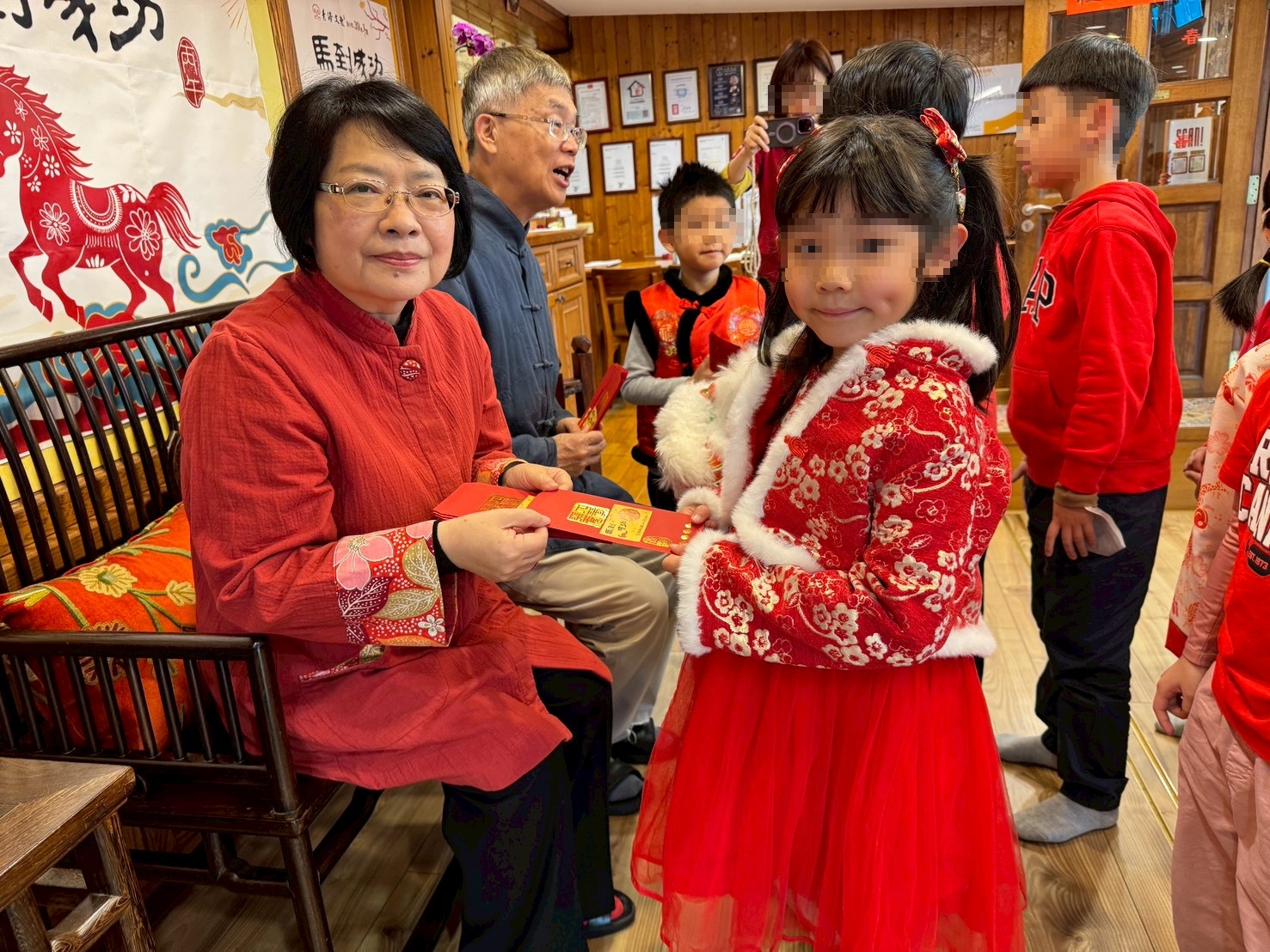 孩子們也準備了充滿創意的馬年吉祥話向二老拜年,如:「馬力十足」、「一馬當先」、「馬上有福」、「好運駿馬來」等,用童真的語言傳遞滿滿的新年祝福。在拜年的過程中,主任特別引導孩子學習進退有度、應對得宜,懂得尊重長輩、謙遜有禮,將「知書達禮」落實於實際行動之中。